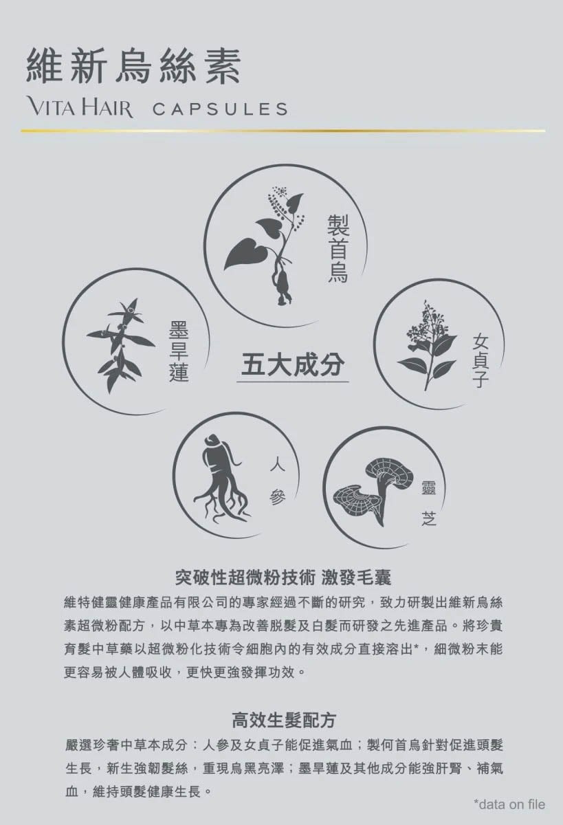 - 配合制首烏﹑墨旱蓮等活髮中草本成分,各成分具協同作用,有助補好兩大生髮臟腑肝腎,防脫兼生髮